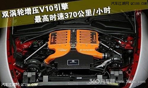 动力部分,宝马M6所搭载的5.0升V10引擎加上双ASA机械增压系统,使得最大马力提升了95kW,来到473.5kw/7300rp境界,峰值扭力则为635Nm/6300rpm,可让此款作为改装示范车的M6敞篷车于4.1秒完成0-100km/h的加速外,0-200km/h也仅需10.9秒,对于一辆重达两吨的轿车而论,已属相当顶尖的性能表现,别忘了从静止达到300km/h也只需要34.5秒,更别说是370km/h的极速了!