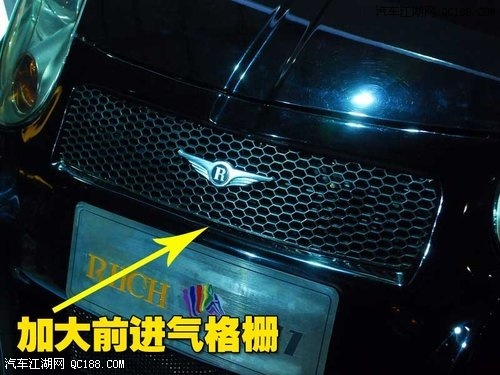 瑞麒M1改装车的前格栅进行了加大处理,网格状也很乍眼,虽然动力未作改变,但这也是一个大的改变。