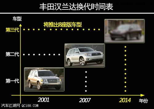 丰田首次推出第一代汉兰达的时间可以追溯到2001年,时至今日经历换代、改款、国产化后外型曾几经改变,如今该车将在2014年迎来换代。近日丰田官方宣布:第三代汉兰达将于即将开幕的纽约车展中首发亮相,量产车型将于2014年推出,而换代车型有望推出8座版同时将采用混合动力系统。